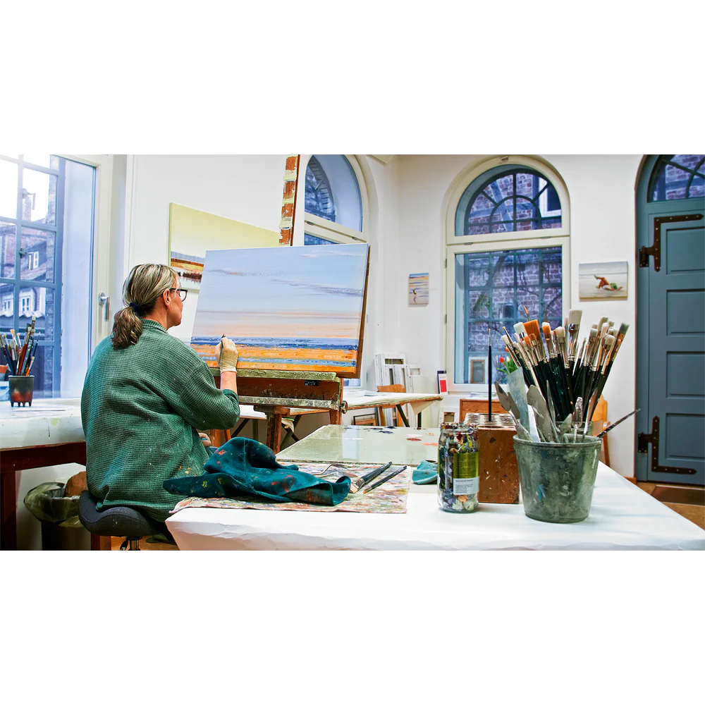Wenige Motive interessieren die Malerin Anja Struck so sehr, wie Menschen inmitten der Natur des Nordens. Die Nuancen von Blau, Grau, Braun, und das Licht, das diese Landschaften aus Wasser und Sand kennzeichnen, sind so einzigartig, wie die Seele der Menschen, die sie bis ins Mark geprägt haben. Lässt sich so ein Anblick auch nur annähernd wiedergeben, schon gar auf Leinwand bannen? Kein Foto fängt die Weite und Wehmut, die Sehnsucht und Schönheit des Augenblicks ein, wie ihn ein Tag an der Nordsee bieten kann. Sie zu beschreiben, ist Arbeit für Literaten. Dieser Anblick ist so wundervoll, bietet so viel Ruhe und Kraft, dass Anja Struck es zu ihrer Lebensaufgabe gemacht hat, den Horizont des Nordens, seine Stimmungen in ihren Bildern einzufangen. Wenn es denn jemandem gelingen kann, dann ihr!