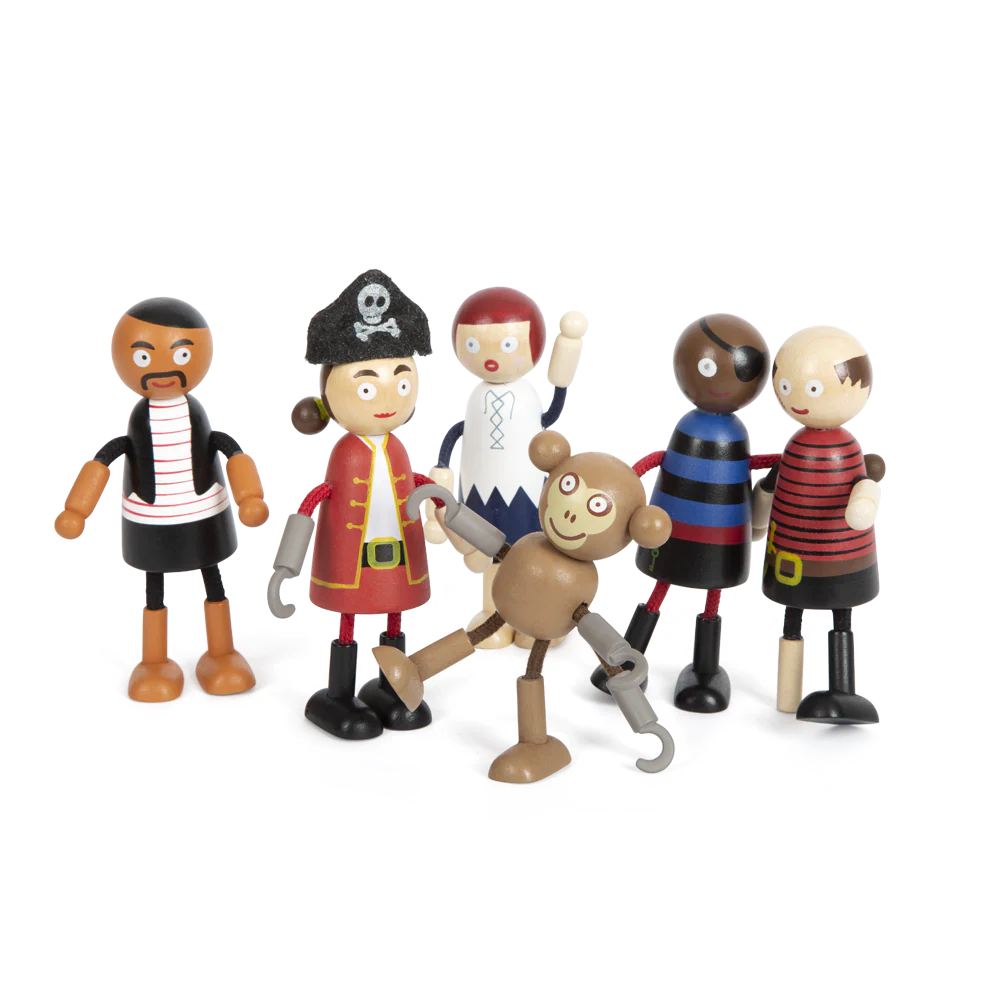 Hier kommt die mutige Piraten-Crew für das berüchtigtste Seeräuberschiff aller Weltmeere! Bestehend aus der Kapitänin mit Hakenhand, ihren vier Crew-Mitgliedern und einem niedlichen Äffchen, verspricht diese biegsame Freibeutergruppe fantasievollen und realitätsnahen Spielspaß für jedes Piratenschiff im Kinderzimmer. Äußerst flexibel, strapazierfähig und detailreich gestaltet, lassen sich die Biegepuppen aus Holz dank ihrer Arme und Beine aus textilummanteltem Draht in verschiedenste Positionen bringen. Für die Extraportion Spielspaß sorgt der Affe, der sich mit seinen Hakenhänden und der Hakenschwanzspitze überall festhalten kann.