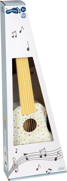 Diese Gitarre darf in keinem Musikzimmer fehlen! In weiß gehalten und mit kleinen, farbenfrohen Akzenten ist das kleine Schmuckstück einfach ein Muss für jeden kleinen Musikliebhaber. In einer richtigen Band darf die Gitarre nicht fehlen. Mit diesem bunt gestalteten Musikinstrument kommt Rhythmus ins Kinderzimmer. Hier werden die ersten Griffe für eine Melodie geübt und das Taktgefühl kommt dann ganz von alleine.