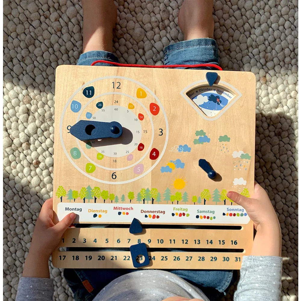 - Als Kalender vermittelt die multifunktionale Lerntafel in leicht verständlicher Weise ein Verständnis für Monate, Wochentage, Jahres- und Uhrzeiten, inkl. Aufhängung