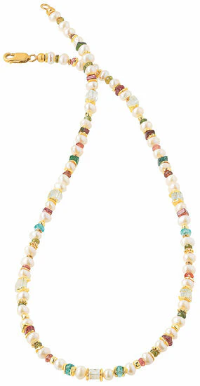 Dieses zarte Arrangement aus Süßwasserzuchtperlen, Turmalin, Aquamarin und Elementen aus feingoldplattiertem Silber passt zum farbenfrohen Sommerkleid ebenso wie zum eleganten Business-Outfit.