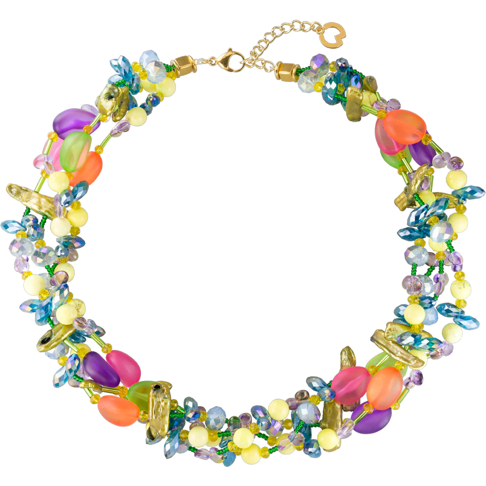 Warm leuchtende Perlen aus Howlith, verflochten mit kühl funkelnden Perlen aus facettiertem Muranoglas und 24 Karat vergoldetem Messing wecken die Erinnerung an einen Sommertag. Abgerundet mit kräftig grünen Rocailles Perlen, leuchtend bunten Steinen aus Muranoglas, violett schimmernden Tropfen aus Fluorid und Elementen aus olivfarbenen Biwaperlen ist das Schmuckset Tesoro ein erfrischender Blickfang zu jedem Anlass. Handgefertigt, daher jedes Schmuckstück mit Unikatcharakter.