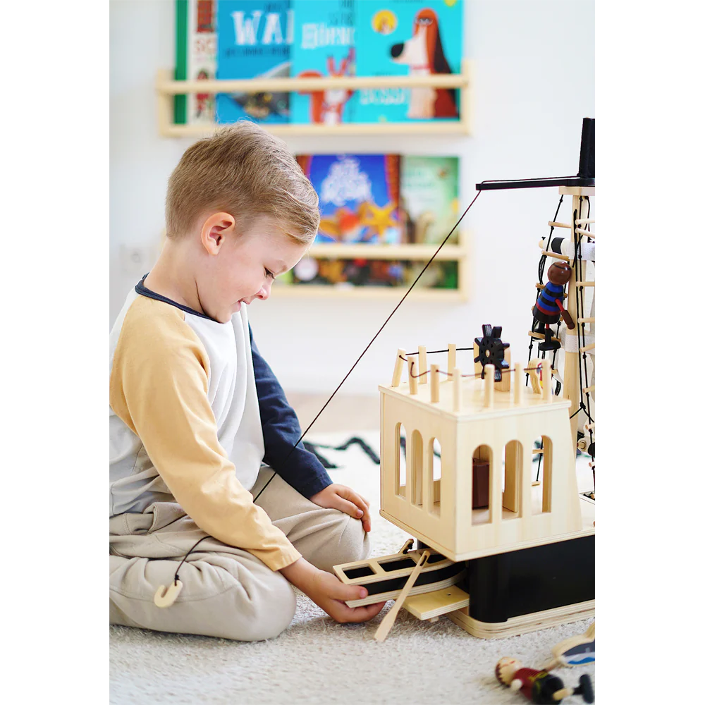 - geräumiges Piraten-Spielschiff aus robustem Holz mit viel Stauraum im Schiffsbauch und abnehmbaren Masten