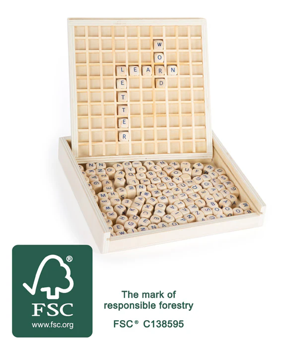 Mit diesen Buchstabenwürfeln aus FSC® 100%-zertifiziertem Holz lassen sich die ersten Wörter legen. Mit dem Einlegebrett bleiben sie da, wo sie hingehören und verrutschen nicht. Verstaut wird alles in einem Holzkasten und kann gut transportiert werden. Dieses Spiel fördert die Rechtschreibung und die Wortschatzerweiterung.